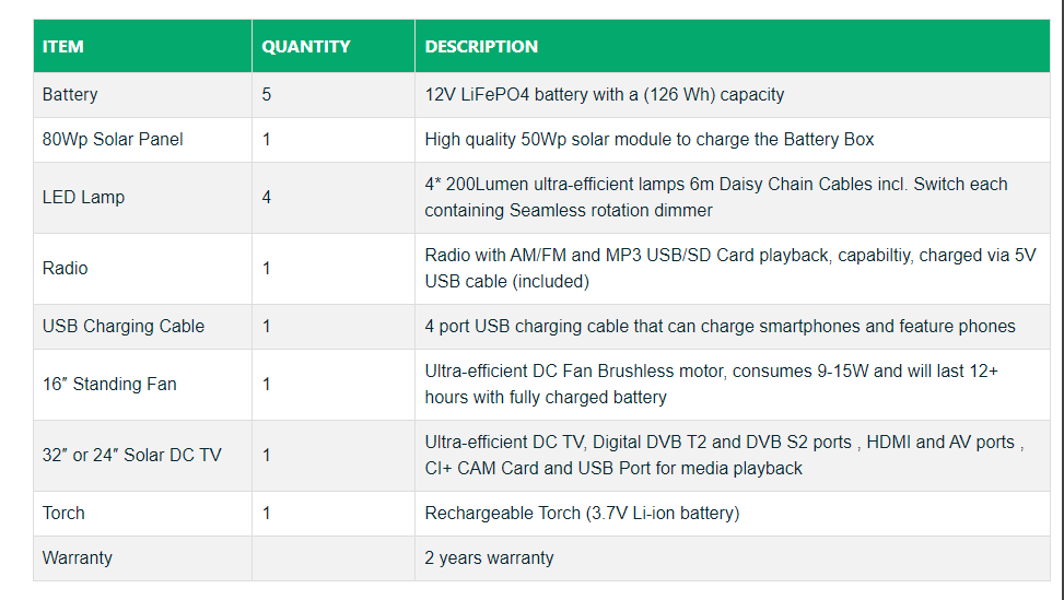 32″ or 24″ Solar DC TV 1 Ultra-efficient DC TV, Digital DVB T2 and DVB S2 ports , HDMI and AV ports , CI+ CAM Card and USB Port for media playback